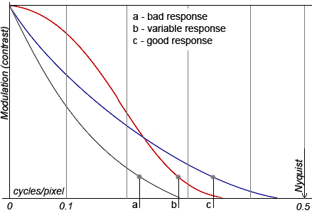 На рисунку показані три прикладу відгуку оптичної системи. У випадку а відгук млявий, контраст швидко падає при збільшенні частоти. У випадку b контраст добре передається для невисоких частот, але передається гірше ніж у випадку c для високих частот. При цьому у випадку вимірювання роздільної здатності способом які описані в першому пункті, кращий результат швидше за все буде у випадку c.